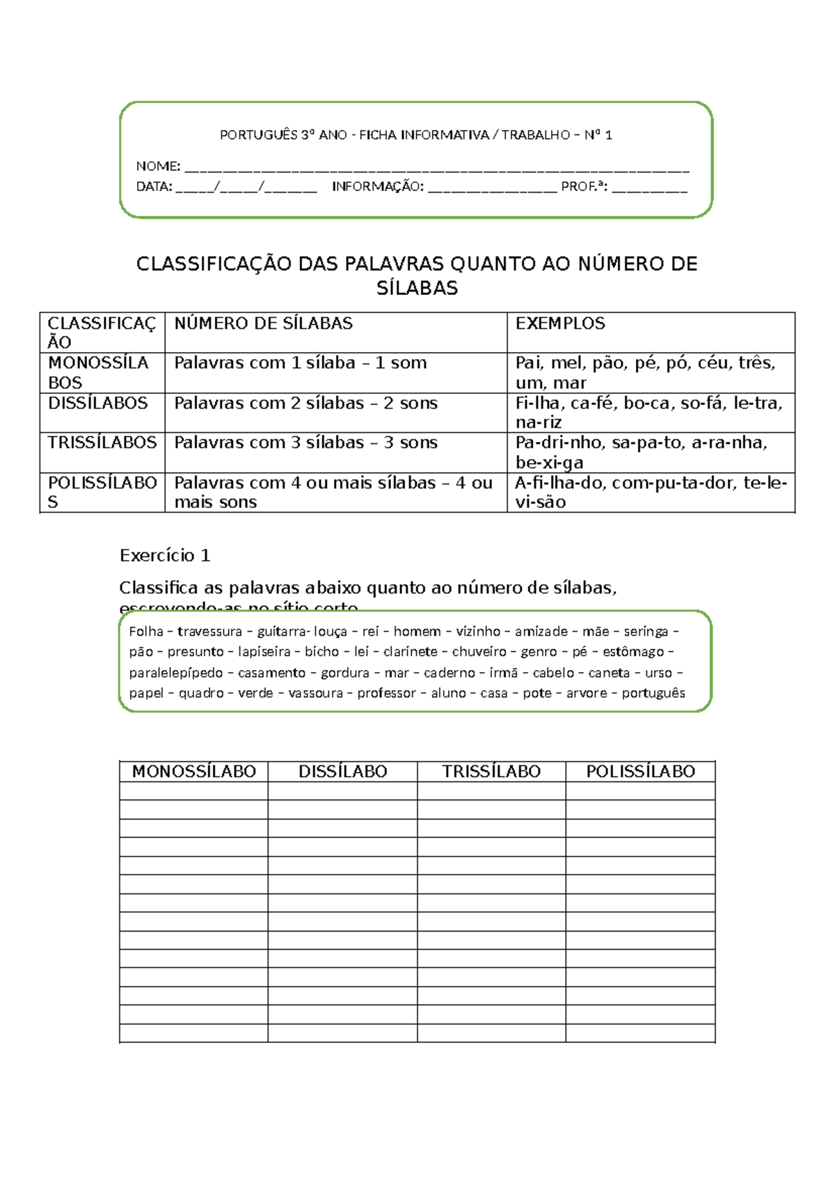 Classificação Das Palavras Quanto Ao Número De Sílabas 3 Ano - BINKEDU