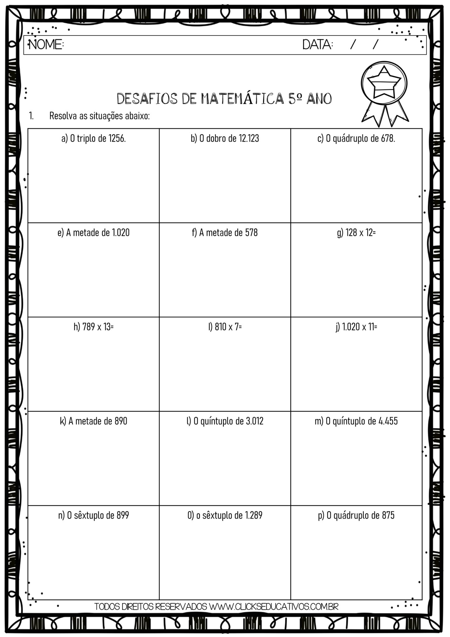 Exercícios de matemáticaparaalunos do quintoano,desafiosenvolvendo multiplicações. Está disponívelparadownload em modelo do Word, em PDF prontoparaimprimire também a atividade respondida.